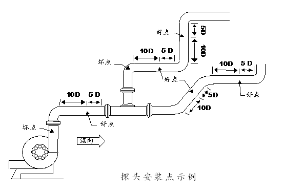 選擇測量點時要求選擇流體流暢分布均勻的部分,為保證測量精度。一般應(yīng)遵循下列原則: